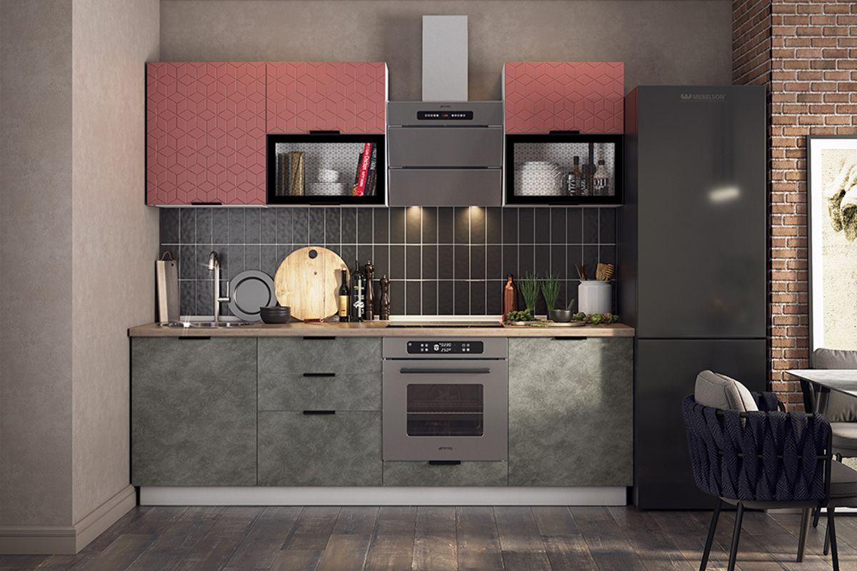 Кухонный гарнитур 6 Стоун ширина 240 см - это невероятно стильный и современный готовый кухонный гарнитур: модное цветовое решение, оригинальная стильная фрезеровка верхних фасадов, стекло с графичным принтерным рисунком в алюминиевой рамке в цвете чёрный муар.