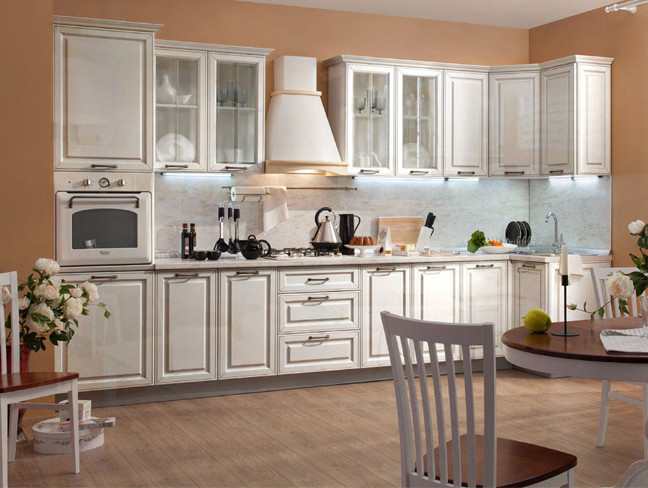 Кухня изготовлена из ЛДСП 16 мм, кромка ПВХ 0,4 мм, используется фрезеровка на фасаде. Ящики-метабокс на роликовых направляющих. Фасады МДФ имеют покрытие эмаль с эффектом патины. Стекло в витринах прозрачное с фацетом. Ручки металлические, мебельная опора регулируется.