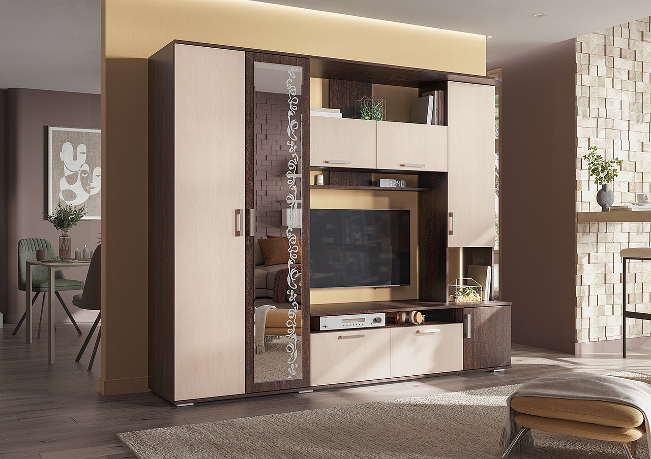 Гостиная Софи - это сочетание стиля, красоты и качества. Гостиная сочетает в себе большое количество напольных и навесных полок, также в ее составе имеются: вместительных шкафа, шкаф-пенал и ниша для TV . Шкаф гостиной украшает зеркало с пескоструйным рисунком. Гостиная представлена в двух цветовых вариантах, на ваш выбор.